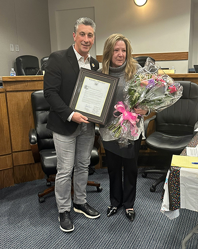 Photo credit Belleville Township: Mayor Michael Melham with Municipal Clerk Kelly Cavanagh. She was honored this week for her 31 years of service to Belleville.