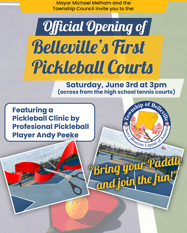 Posted May 24, 2023Join us for the official opening of Belleville's First Pickleball Courts on Saturday, June 3, 2023 at 3 p.m. The Pickleball Courts are located across from the high school tennis courts at 100 Passaic Ave.