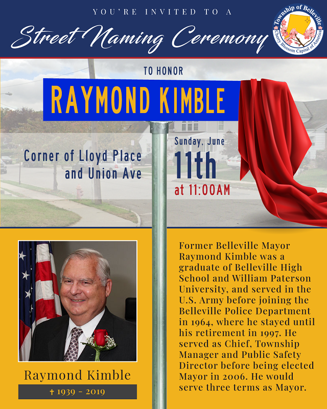 Former Belleville Mayor Raymond Kimble was a graduate of Belleville High School and William Paterson University, and served in the U.S. Army before joining the Belleville Police Department in 1964, where he stayed until his retirement in 1997. He served as Chief, Township Manager and Public Safety Director before being elected Mayor in 2006. He would serve three terms as Mayor.