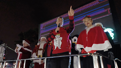 Photo Credit Belleville Township: Mayor Michael Melham directing residents' attention to the tree just before he pushed the plunger to light it up.