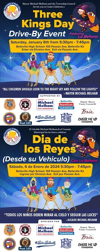 Posted December 21, 2023Inviting all Belleville Families to take part in the Township's Three Kings drive-through event. Children of all ages should look up to the sky Saturday night, January 6th and follow the lights to the fifth annual Three Kings Day celebration. The light will be leading all to make the pilgrimage to Belleville High School (100 Passaic Ave). The celebration will run from 5:30 p.m. to 7:45 p.m. Participants should enter via Division Ave and will exit via Passaic Ave. Note - The cut off for the line will be at 7:45pm sharp. You MUST be on line prior to 7:45pm.