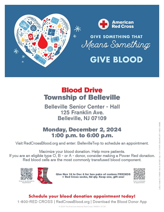 Posted November 04, 2024The Township of Belleville, in partnership with the American Red Cross, invites you to make a difference by donating blood at our upcoming community blood drive. This is your chance to "Give Something That Means Something" by giving the gift of life this holiday season.