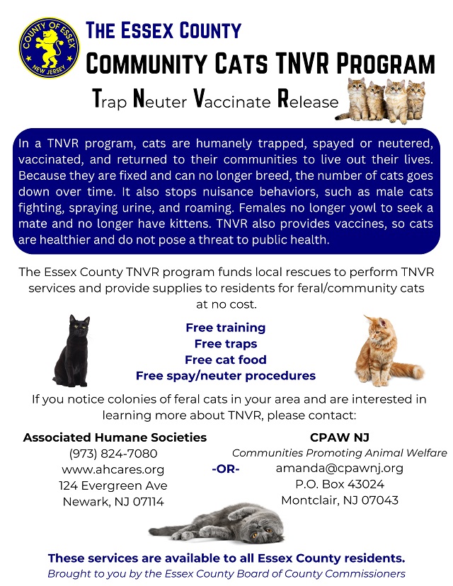 Posted November 18, 2024The Essex County TNVR program is dedicated to helping control the population of feral and community cats in a humane and effective way. By trapping, spaying or neutering, vaccinating, and releasing cats back into their communities, the program ensures healthier, safer neighborhoods for people and animals alike.