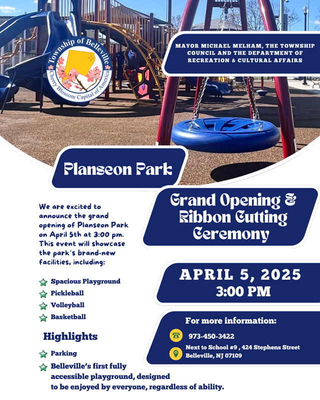 Posted March 27, 2025Mayor Michael Melham, the Township Council, and the Department of Recreation & Cultural Affairs proudly invite you to celebrate the exciting grand opening of Planseon Park!