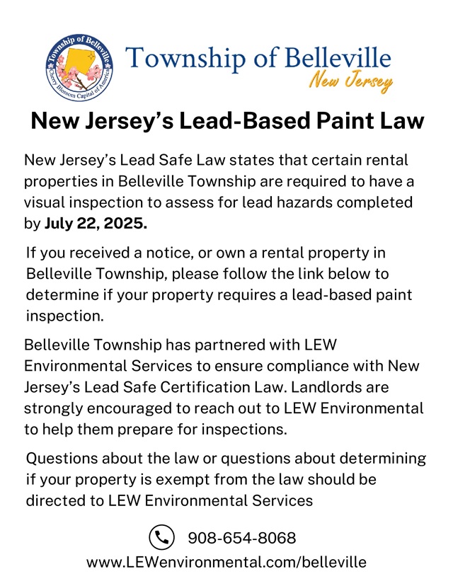Posted April 09, 2025New Jersey’s Lead Safe Law states that certain rental properties in Belleville Township are required to have a visual inspection to assess for lead hazards completed by July 22, 2025.