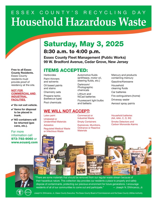 Help keep our communities and environment safe! Properly dispose of hazardous household materials at Essex County’s upcoming recycling day.