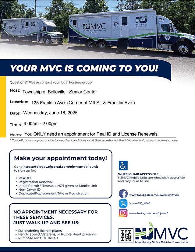 Posted June 11, 2025The New Jersey Motor Vehicle Commission’s (NJMVC) “Agency-on-Wheels” Mobile Unit will be coming to Belleville.