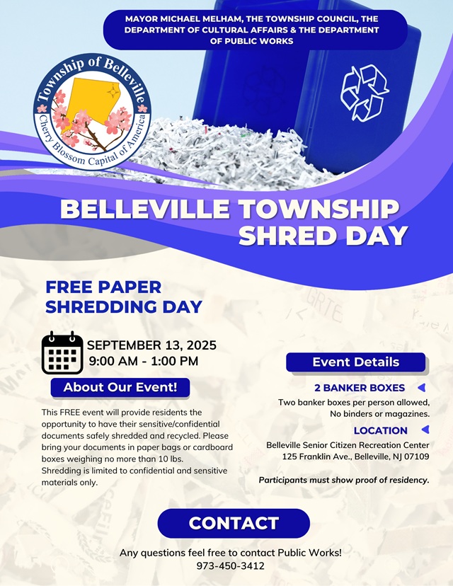 Belleville residents are invited to safely dispose of their confidential and sensitive paper documents during this FREE shredding event. Documents will be securely shredded and responsibly recycled.